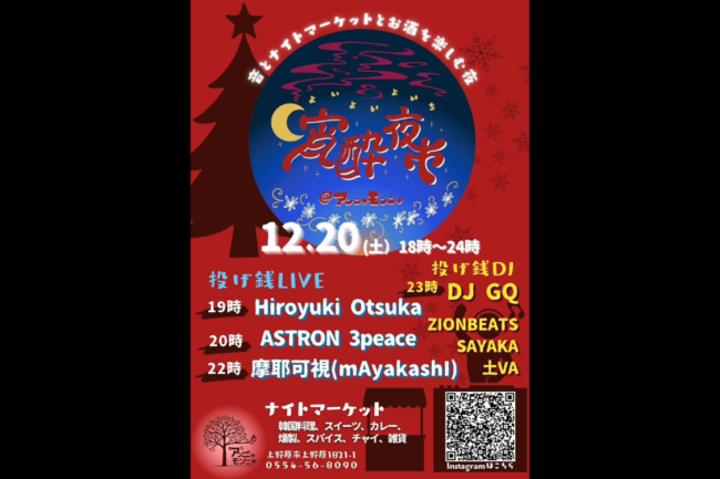 13 12月 2025 otsuka 未分類 2025年12月13日 otsuka 2024.Dec.20(sat) 上野原アンニャモンニャ 【LIVE】大塚 寛之 / ASTRON 3peace / 摩耶可視(mAyakashi) 【DJ】SAYAKA / ZIONBEATS / 土VA / DJ GQ 【ナイトマーケット】 韓国料理、スイーツ、カレー、燻製、スパイス、チャイ、雑貨 【イベント時間】18:00~24:00 【Charge】 投げ銭 【Address】 山梨県上野原市上野原1821-1