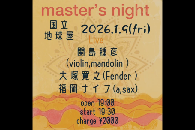 05 1月 2026 otsuka 未分類 2026年1月5日 otsuka 2026.Jan.09(fri) 国立 地球屋 =master’s night= 【出演】関島種彦 / 大塚寛之 / 福岡ナイフ 【Open】19:00 【Start】19:30 【Charge】¥2000 【Address】〒186-0002 東京都国立市東1丁目16−13 諸橋ビル B1