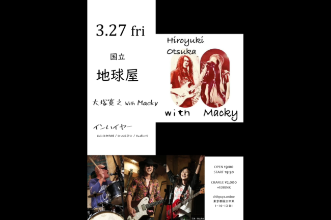 09 3月 2026 otsuka 未分類 2026年3月9日 otsuka 2026.Mar.27(fri) 国立 地球屋 【出演】 大塚寛之とマッキー / インハイヤー (VoGt.北神裕輔 / Dr.松尾光公 / Ba.横山玲) 【Open】19:00 【Start】19:30 【Charge】¥2000 + 1drink 【Address】〒186-0002 東京都国立市東1丁目16−13 諸橋ビル B1