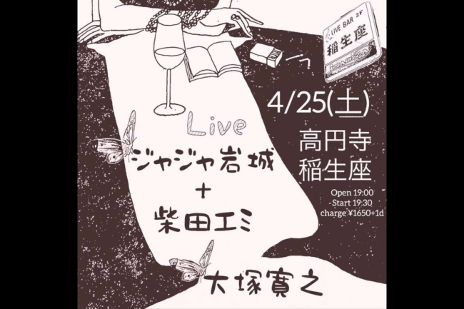 16 4月 2026 otsuka 未分類 2026年4月16日 otsuka 2026.Apr.25(sat) 高円寺 稲生座 【演奏】ジャジャ岩城+柴田エミ / 大塚 寛之 【Open】19:00 【Start】19:30 【Charge】¥1650+1drink 【Address】166-0002 杉並区高円寺北2-38-16 サニーマンション2F